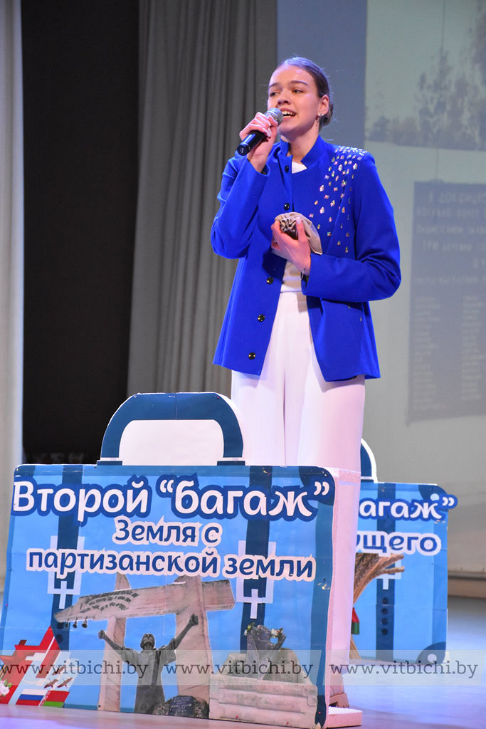 На сцене с креативными презентациями о своей учебе, общественной деятельности выступили талантливые ребята из Витебска, Полоцка, Новополоцка, Орши, Браслава. Например, Артём Бычков из Полоцка продемонстрировал многогранник с фотографиями и рассказал о нем. Каждая грань – отдельный этап активной деятельности молодого полочанина. Ангелина Масловская из Докшиц вышла на сцену с импровизированными чемоданами и рассказала, что хотела бы попасть в этом году на «Поезд Памяти» не как путешественник, а как проводник. Юной активистке есть что рассказать о героях-освободителях Беларуси и в особенности об известном общественном деятеле, женщине-патриоте Ульяне Кришталевич. Ее имя носит средняя школа № 2 в Докшицах.