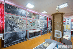 – Через нашу местность семь месяцев проходила линия фронта, с декабря 1943-го по июнь 1944-го. 27 тысяч похоронок ушло отсюда за это время. Поэтому создать музей боевой славы было делом чести школы. Его открыли еще в 1982-м. Постоянно обновляем экспозиции, – говорит Василий Александрович. – Из последних обновлений – стенд «Память земли». В специальных колбах привезли землю с тех мест, где существовали лагеря смерти: из Олы, Борков, Марьяново, 5-го полка в Витебске, Озаричей, Тростенца, Освенцима и других. Таким образом, рассказываем школьникам о геноциде белорусского народа, зверствах фашизма.