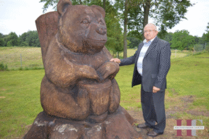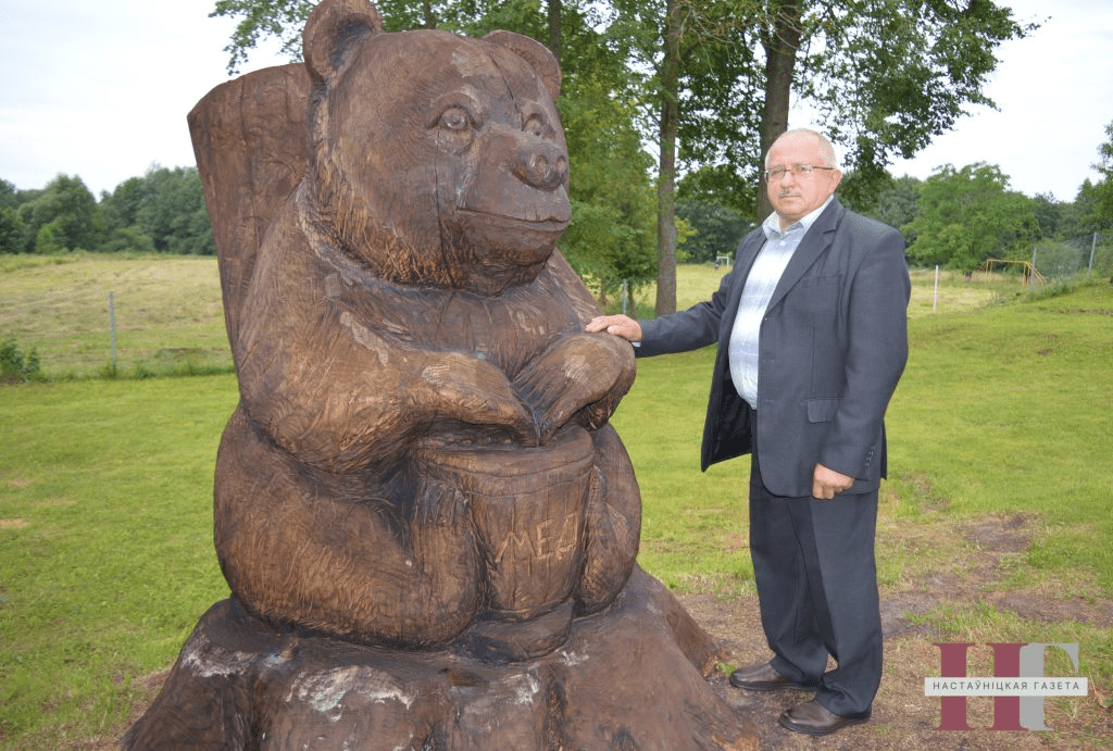 — Звыш двух тыдняў. Калі б карыстаўся традыцыйнымі прыладамі для разьбы па дрэве — рознымі стамескамі-разцамі, заняло б значна больш часу. Таму прымяніў навацыю: працаваў у асноўным бензапілой. Таксама не сказаць, каб далося вельмі лёгка, бо спатрэбілася і літаральна на будучага Мішку залазіць, і на лесвіцы гадзінамі стаяць з інструментам у руках. На постаці мядзведзя спыніўся з улікам матэрыялу. Плюс гэта архітыповы вобраз — адлюстраванне народных уяўленняў пра сілу прыроды і волата-абаронца. Мая тэма! Папярэдне, канечне ж, прынёс кіраўніцтву школы статуэтку з гліны, прататып адобрылі і зацвердзілі. Між іншым у дзяцей сваё ўспрыманне нашага Мішкі, пераважна праз казкі. Мне ўжо неаднойчы раілі працягнуць работу, каб з кошыка Маша выглядала. Магчыма, неўзабаве так і будзе. Аднак мне бліжэй думка, каб у кошыку ўгадваліся кніжкі. Мішка ідзе за ведамі — як вам ідэя? Прыемна, што скульптура падабаецца людзям. Хаця сам я не зусім задаволены вынікам. У прынцыпе нармальна для творцы, бо няма мяжы для дасканаласці.