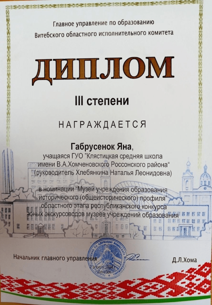 Клястицкая школьница представила обзорную экскурсию-рекламу музея «Наперад у мiнулае» на областном этапе республиканского конкурса юных экскурсоводов и завоевала Диплом III степени.