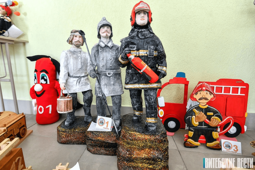 Это рисунки, плакаты, скульптуры, модели специальной техники, а также стихи, сказки и рассказы, посвященные работникам МЧС и вопросам безопасности жизнедеятельности.
