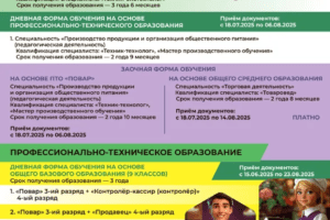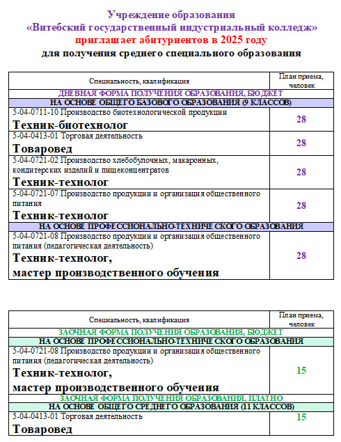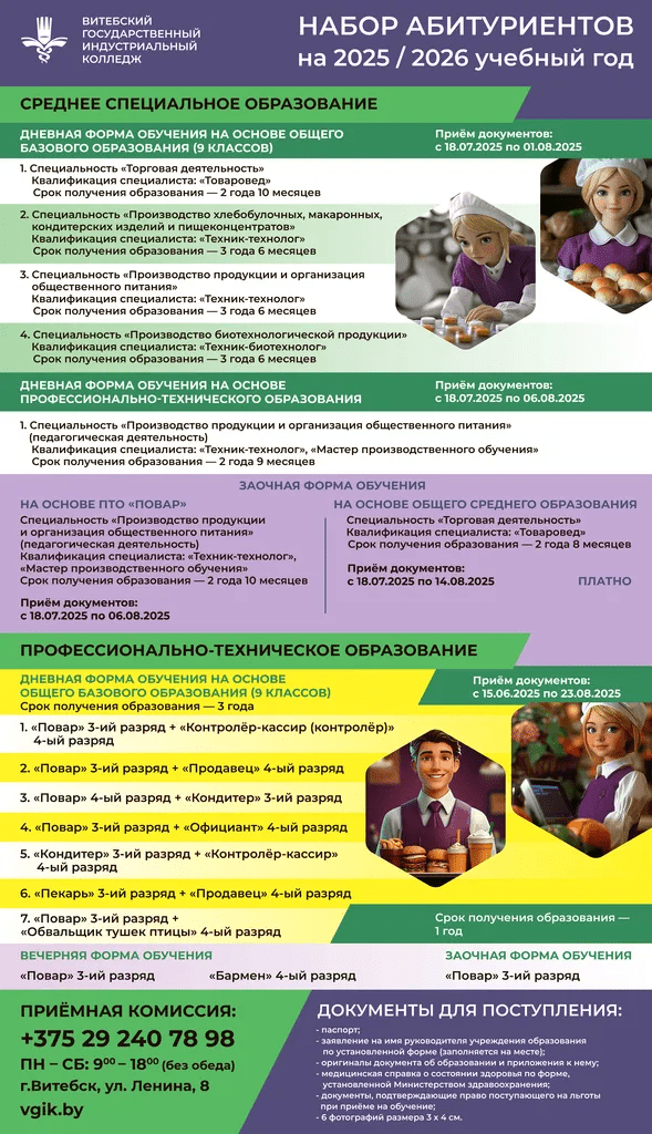 Как и по всей стране, в Витебском государственном индустриальном колледже с 15 июня начинается прием документов на уровень профессионально-технического образования, а с 18 июля — на уровень среднего специального.