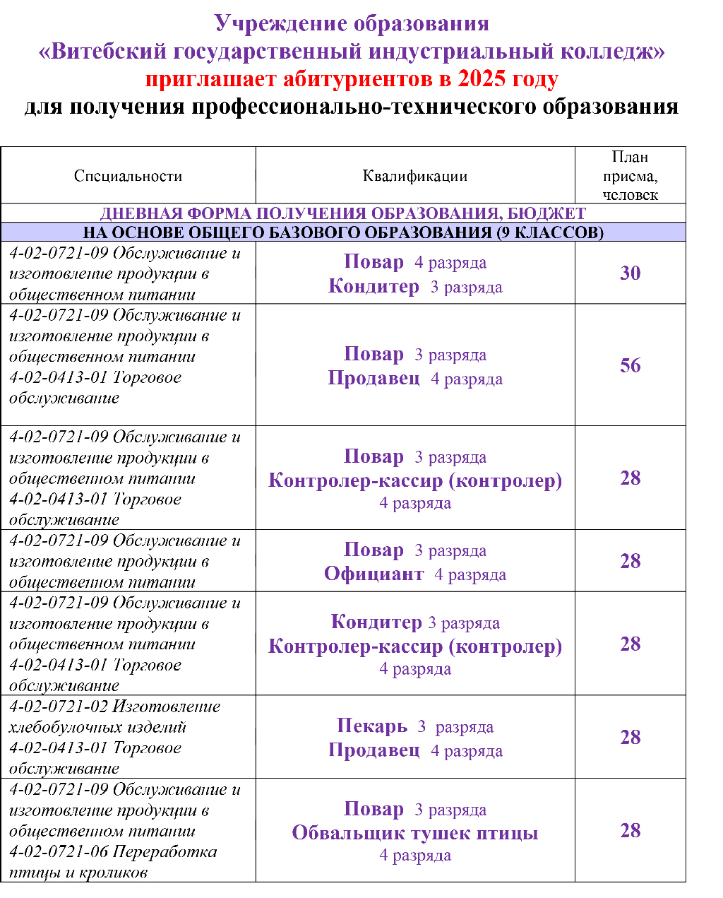Благодаря сотрудничеству ОАО «Витебская бройлерная птицефабрика» и Витебского государственного индустриального колледжа в учреждении образования появилась новая специальность, которая, несомненно, заинтересует абитуриентов, желающих работать в птицеводческой отрасли. С этого года в колледже по заключенному с птицефабрикой договору на подготовку кадров, принимают документы на специальность «переработка птицы и кроликов» с присвоением квалификации «обвальщик тушек птицы».